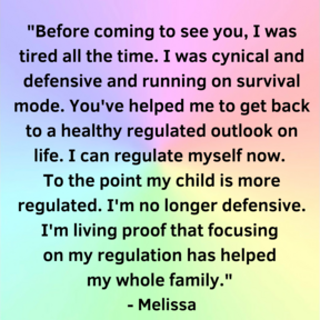 Client's may experience significant improvements in various symptoms as we work together on overall nervous system regulation. Many clients walk into the rainbow room and sit on the table rather than in a chair because the co-regulating touch is their favorite part of their sessions.